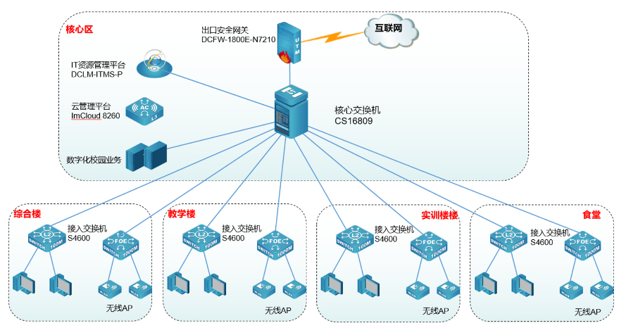 CloudStone 16800独有的管理、控制、数据三平面物理分离,每个平面互不影响,即使管理和控制平面都出现问题,数据仍正常转发,此外CloudStone 16800表项动态可调,支持N:1和1:N虚拟化,智能感知园区网和数据中心网络对核心设备的不同需求,顺利获得VSF虚拟化技术实现整个虚拟化系统中跨设备的链路聚合,简化网络配置,提高了网络连接的带宽和可靠性,保证网络的稳定运行。方便未来网络的扩展。接入层分区具有高密度的接入能力,采用S4600系列具备千兆光口上联,给予主机和服务器的接入,该层支持基于主机端口的访问控制,满足安全的接入,出口采用下一代防火墙DCFW-1800E-N7210,启用了访问控制,攻击防护,流量管控功能,保证网络和用户的安全。同时为实现对学校所有的IT网络资源的全方位监控管理,部署了DCLM-ITMS IT资源管理平台,方便网络管理人员对分散的无线和有线局域网设备进行统一管理,及时发现网络故障。