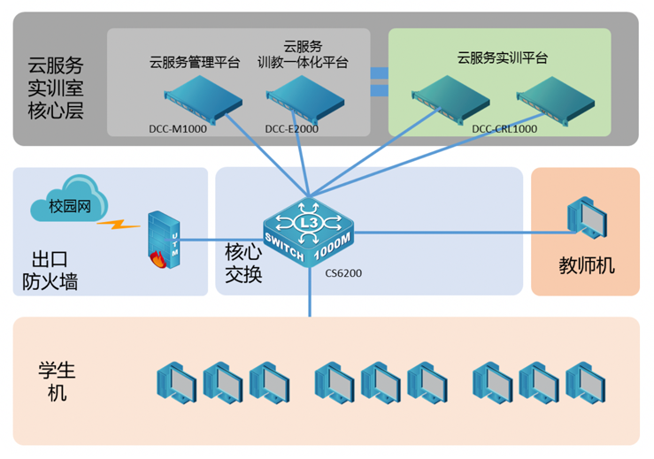 DCC-M1000云服务管理平台,给予软硬一体化的平台,负责云服务实训的统一管理,包括实训管理、用户管理、系统管理、日志管理、网络设置管理等功能模块。产品规格